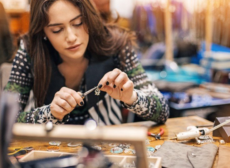 From boho-style earrings to dainty gold necklaces, handmade jewelry has a massive market online. You can start small with beaded designs or explore metal stamping, wire wrapping, and even polymer clay jewelry.